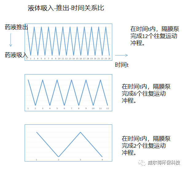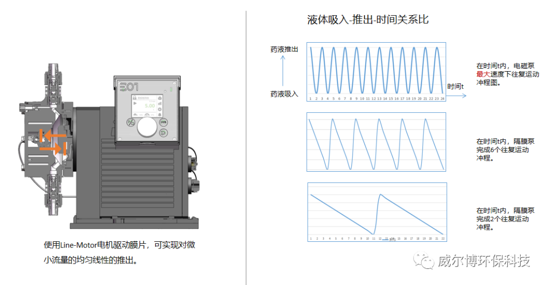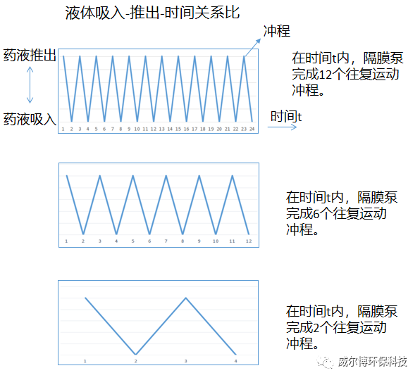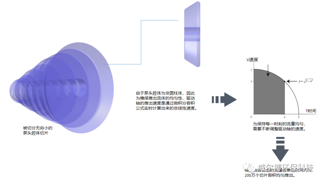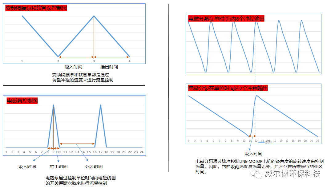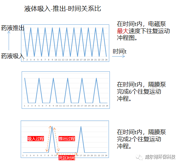 觀察各類型傳統計量泵的原理,你會發現,它們控制的液體吸入和推出時間都是相同的,通過右側的線性圖你y應該很容易理解它們的問題所在,那就是在一個極限慢速的情況下,會導致液體無法被完全吸入泵頭,或者當在極快的速度下,高粘度的液體無法被完全吸入泵頭,從而導致了誤差。