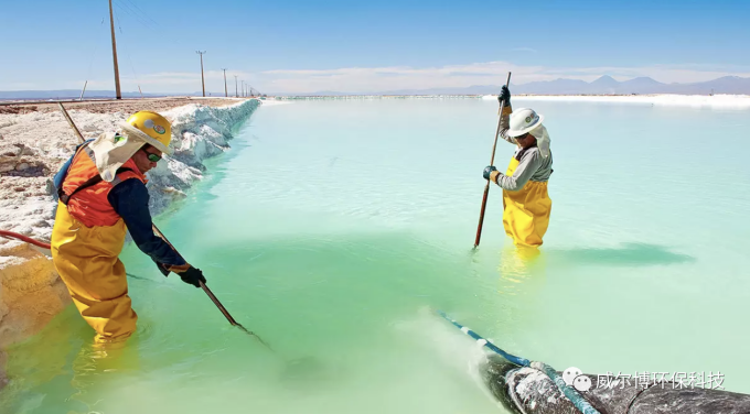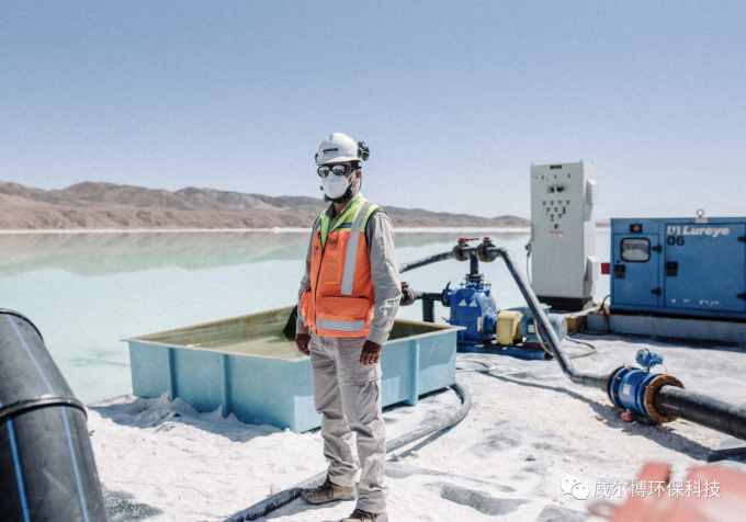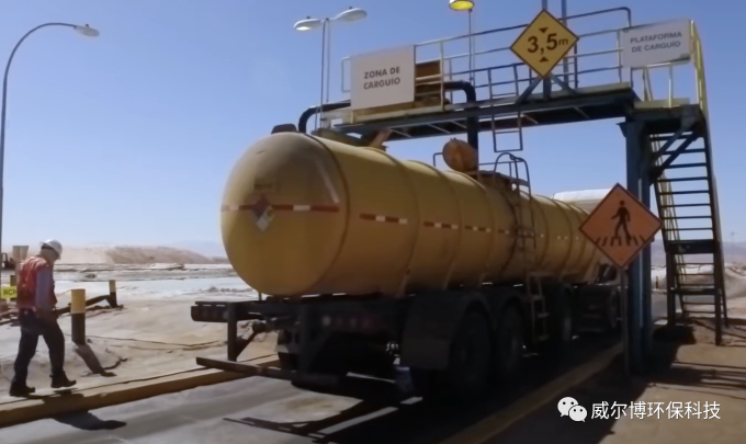 用抽水機抽水。最終,他們將鹽水溶液濃縮到大約含有6%的鋰。這個將池塘由清澈變為藍色,再由藍色變為熒光綠的巨大的工作網絡只是制造電池中所需鋰元素的第一步。當它被濃縮成濃縮液時,工人們就會使用罐車將鋰運輸到位于卡門鹽水湖岸邊的一家治煉廠。